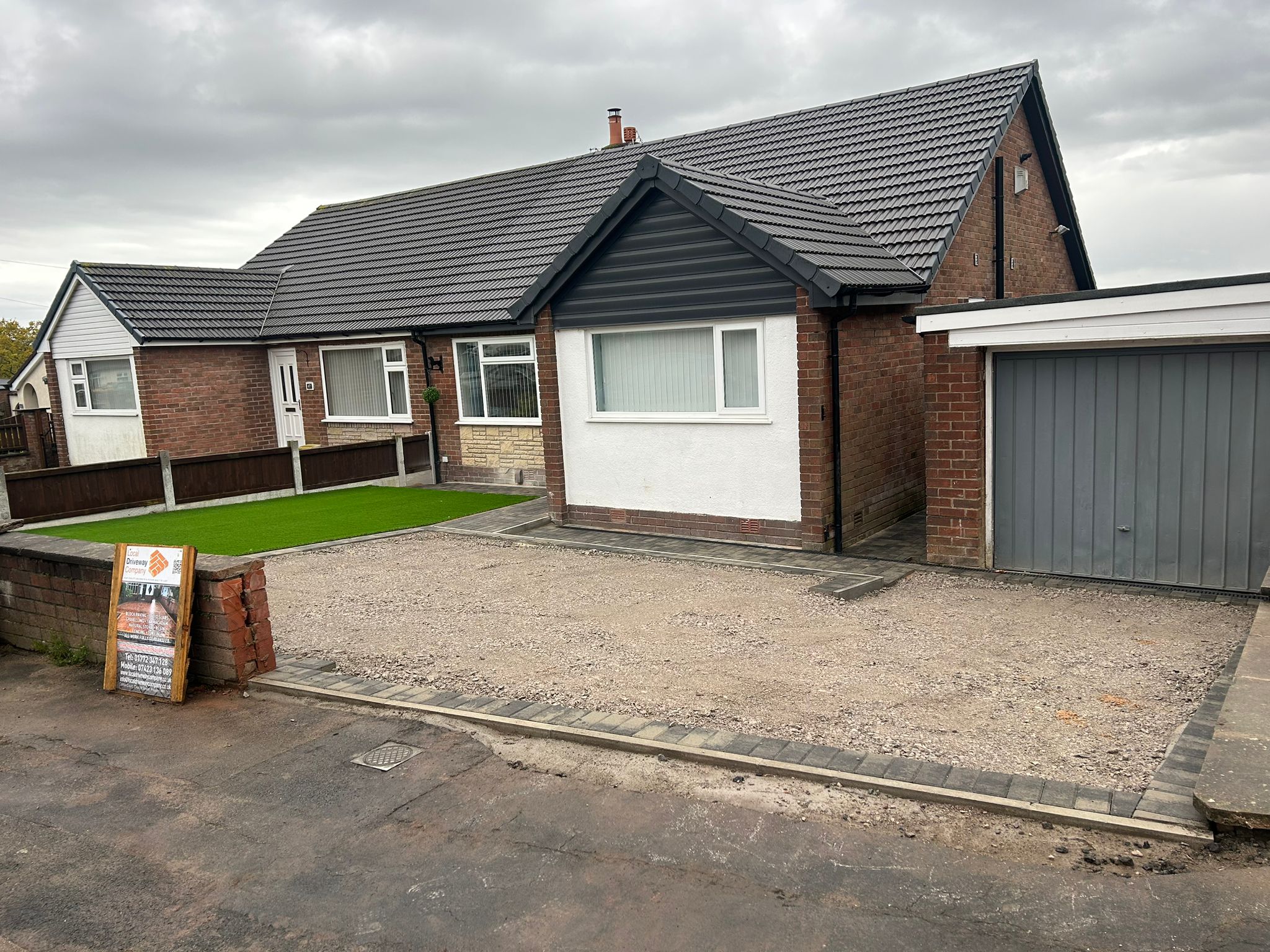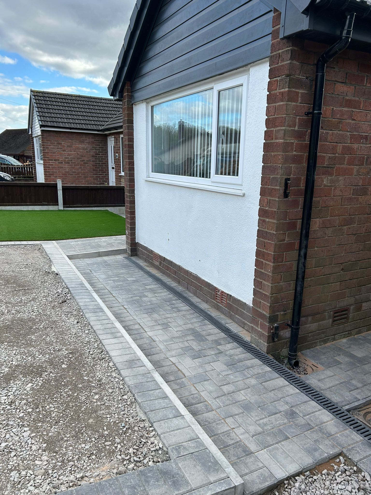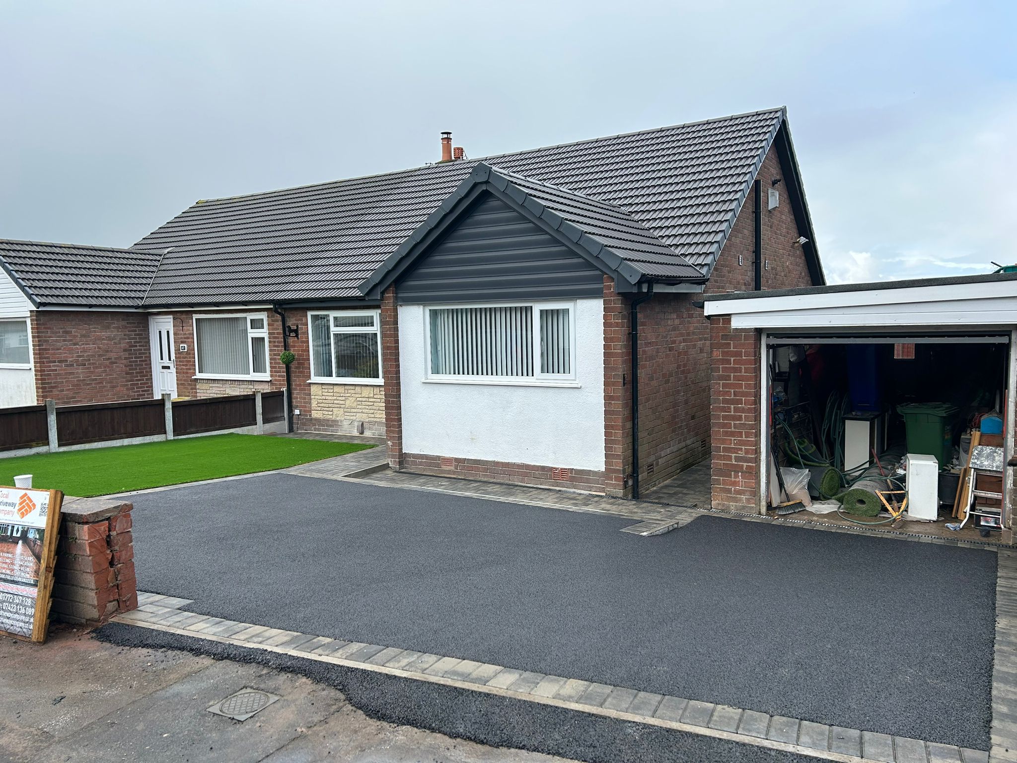 The team has finished installing a new 6mm SMA tarmac driveway, featuring Tobermore Pedesta slate paths and an artificial grass front lawn. This project included a full excavation, installation of a geo-textile membrane, MOT sub-base, ACO drainage channels, and path edgings, seamlessly blending functionality with aesthetic appeal.