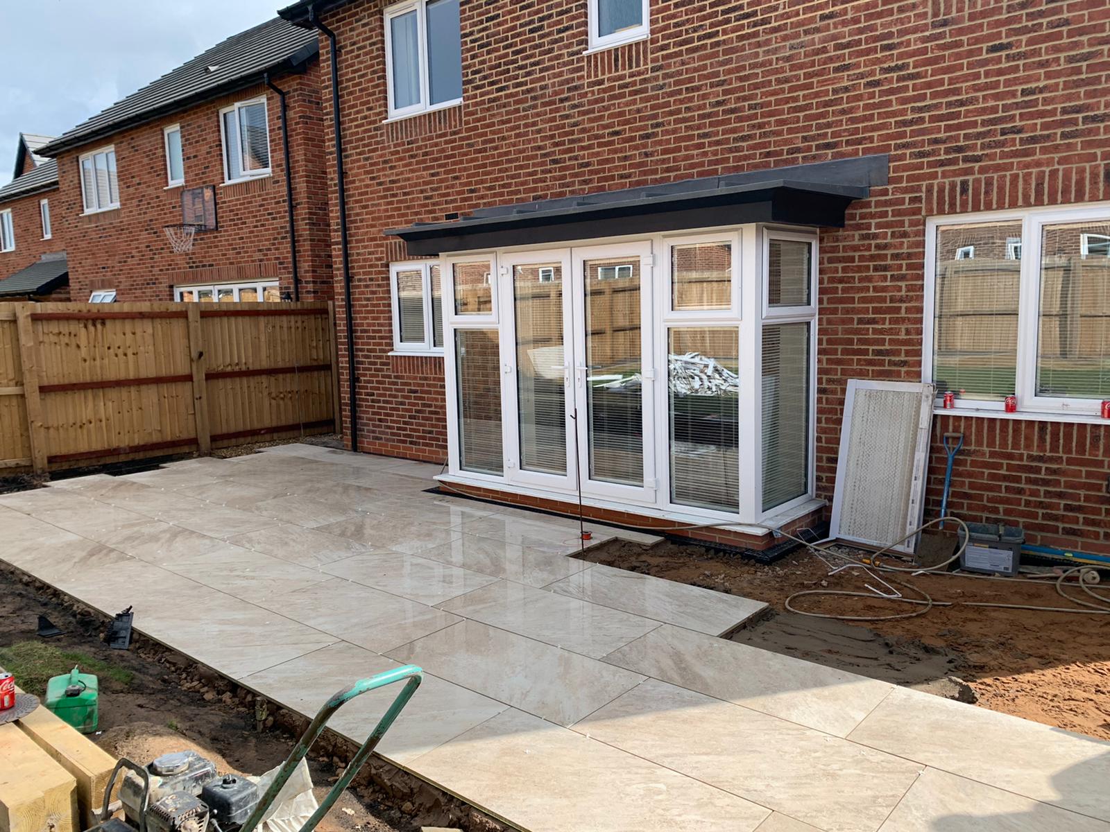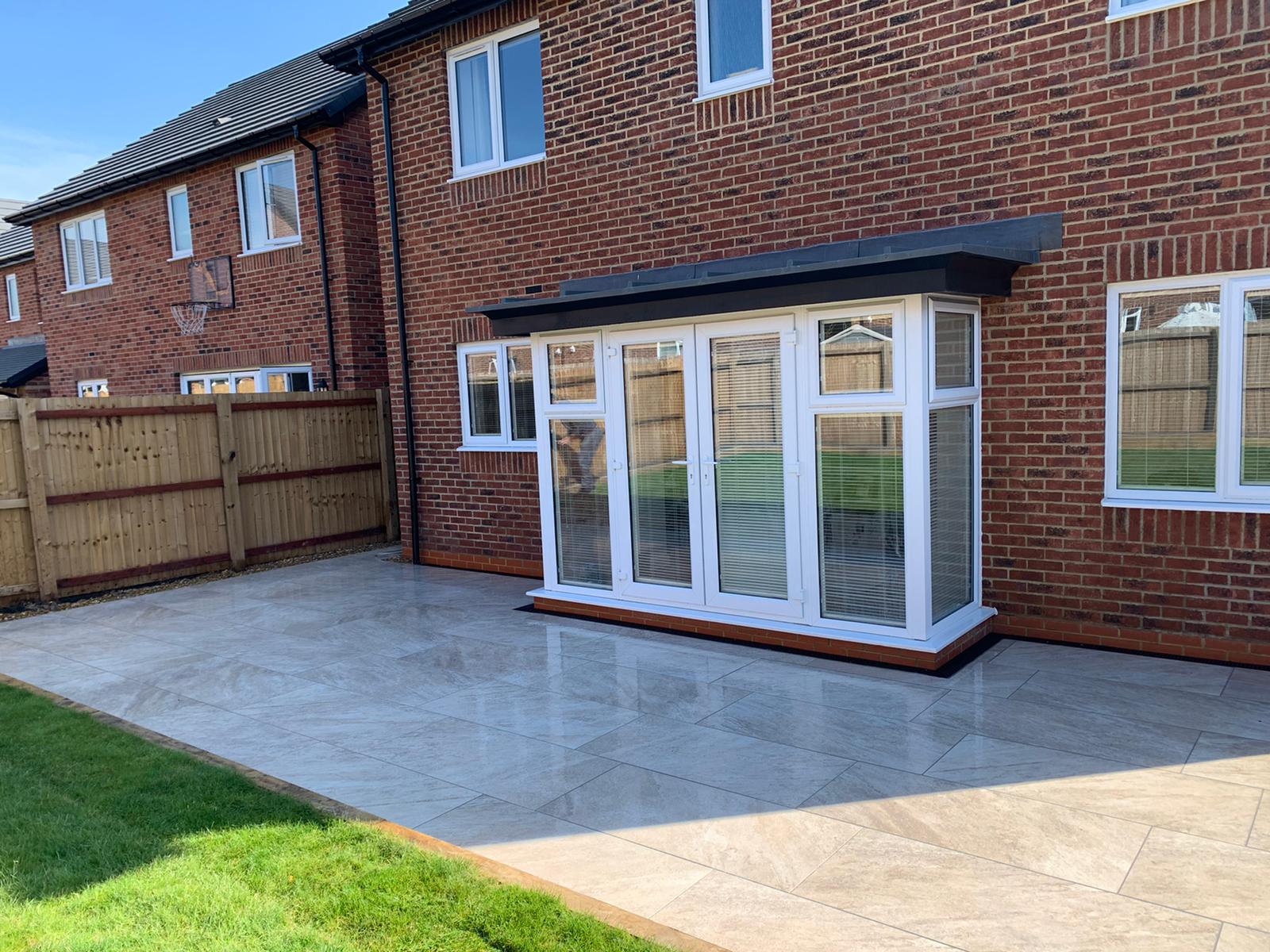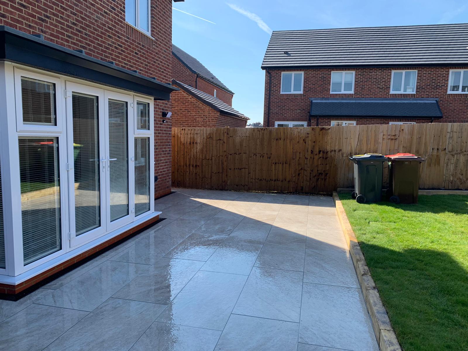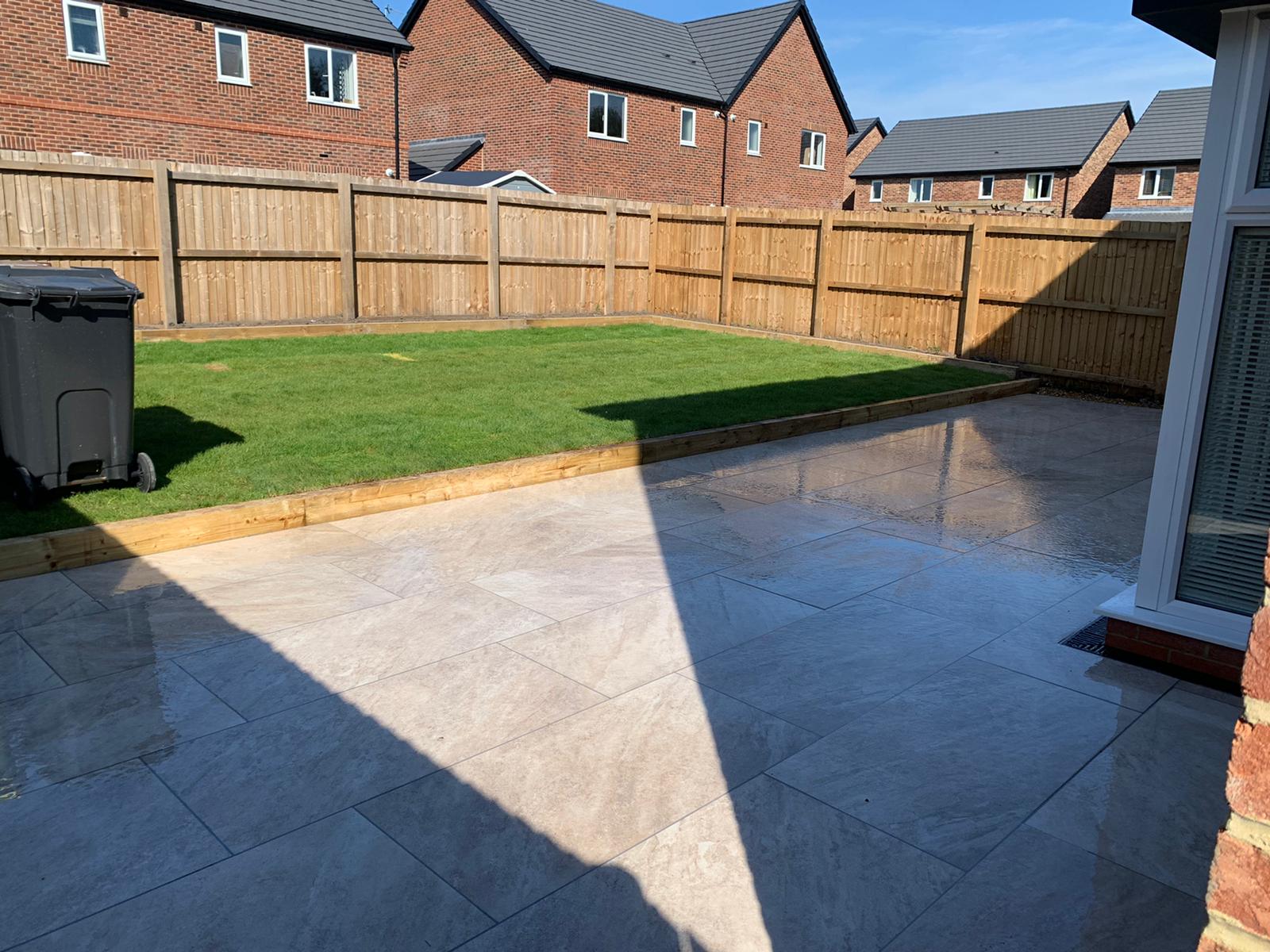 The next part of the installation was to replace the patio at the back of the house. The homeowners wanted part of the back garden removed to make way for a larger patio. As you can now see the porcelain patio is now laid down with a raised railway sleeper and looks extremely slick.