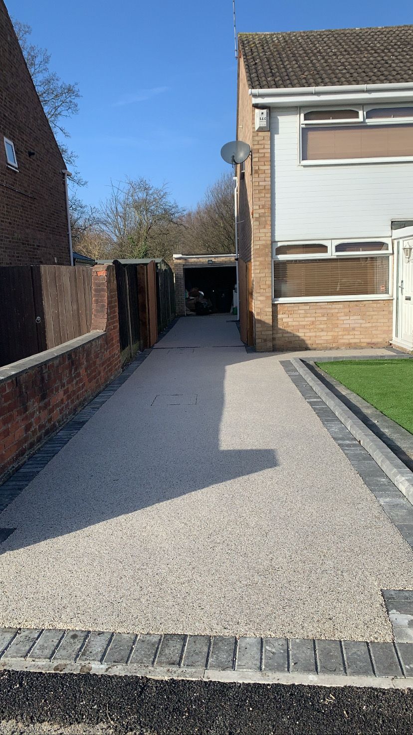 The team headed to Leyland to install an Oyster Pearl UV Resin Driveway with charcoal Pedesta borders and KS Curbs.