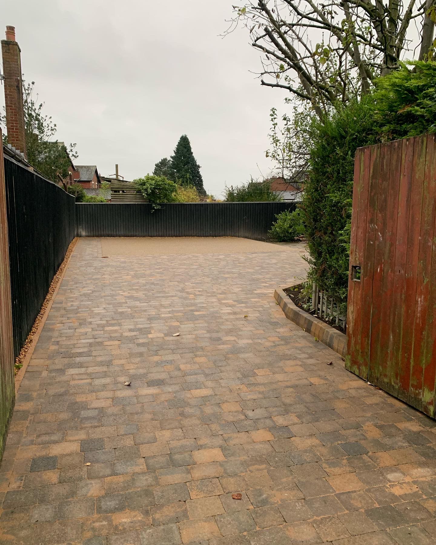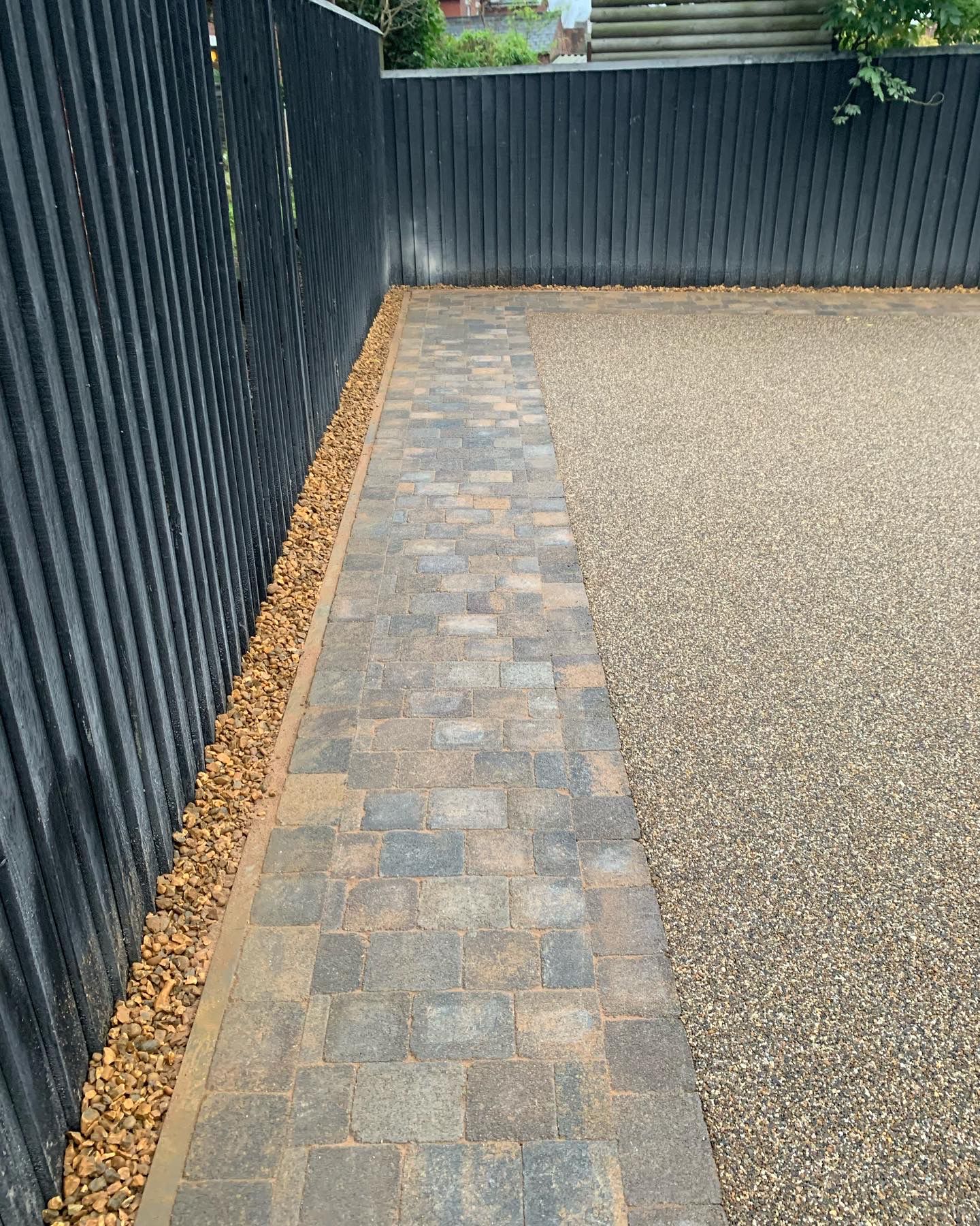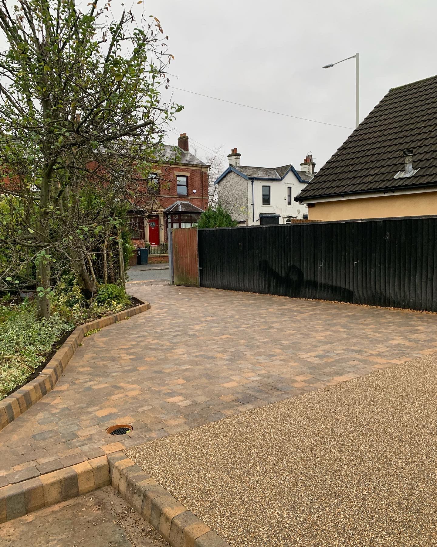 The team headed to Ashton, Preston to install a block paved driveway with bracken KL curbs Sweet Pea UV resin bound and York Green Indian Sandstone.